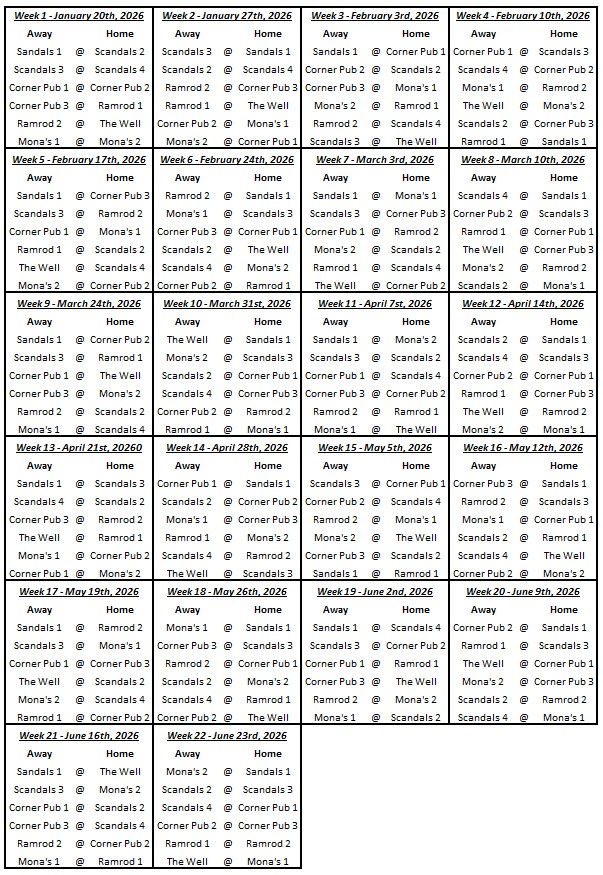 All games will be played on Tuesday evenings at 8:00pm at Sponsoring bars. Competing teams play ten games in two Rounds of five. The Sponsors provide one free drink to all team members at the half–time point between rounds. Members order their usual drinks or one of equal value. Captains or selected players collect the orders as well a one–dollar tip from all members.